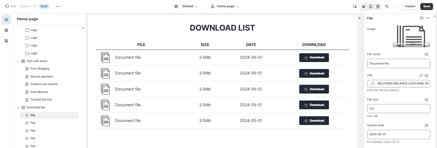 下载列表功能让您能够上传文件供客户随时下载。无论是产品手册、安装指南还是促销资料，都可以轻松添加到您的页面中，为客户提供更加便捷的服务体验。这一功能不仅提升了网站的专业性，还能让客户快速获取他们所需的信息，助您打造更加贴心的购物体验。